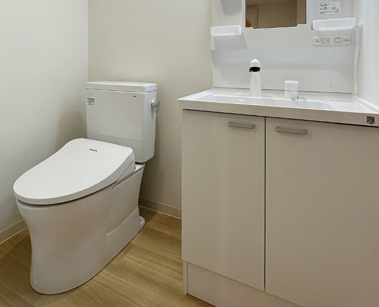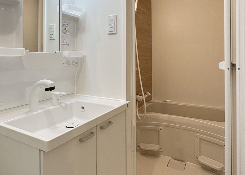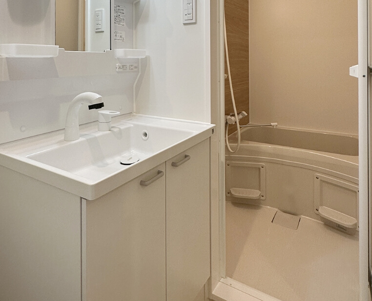 洗い場とバスタブが分かれているので、ゆっくり湯船に浸かることができます。大きな鏡の独立洗面台は、身支度するのに便利。