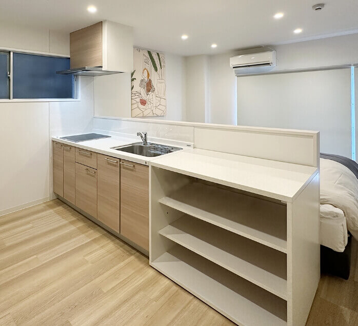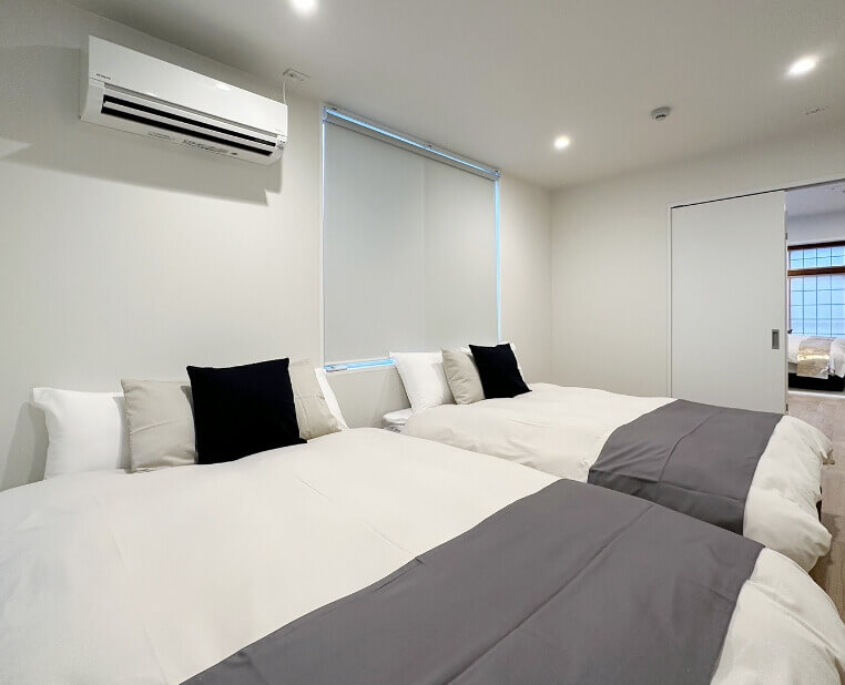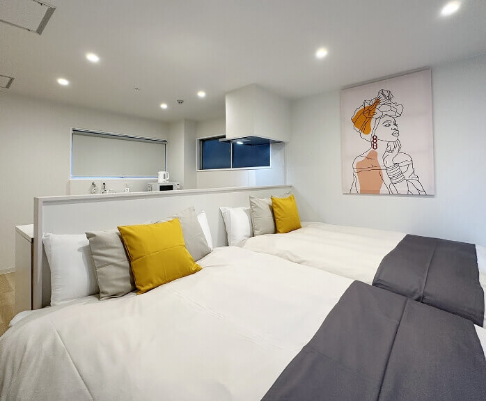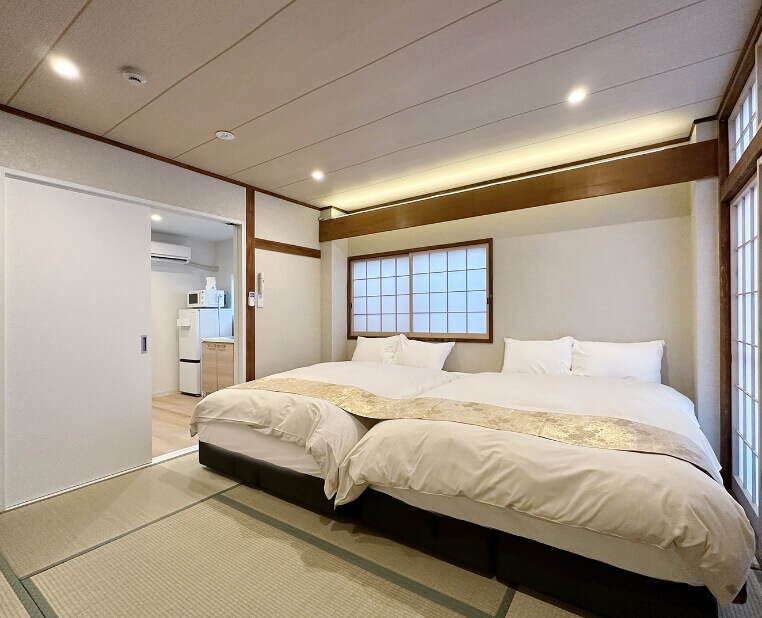キッチンを挟んで2つの寝室が配置された、2DKタイプのお部屋です。温かみを感じるレトロな和室タイプと、モダンなイメージの洋室タイプ、それぞれの寝室に2つのダブルベッドを配置し、最大8名まで宿泊できます。大きめのシステムキッチンで家族や仲間と一緒に地元の食材を使って料理を作るもよし、買ってきたデリをわいわい食べるもよし。まるでわが家のように、自由なスタイルで楽しめます。また、各居室にエアコンを完備しているので、快適におくつろぎください。