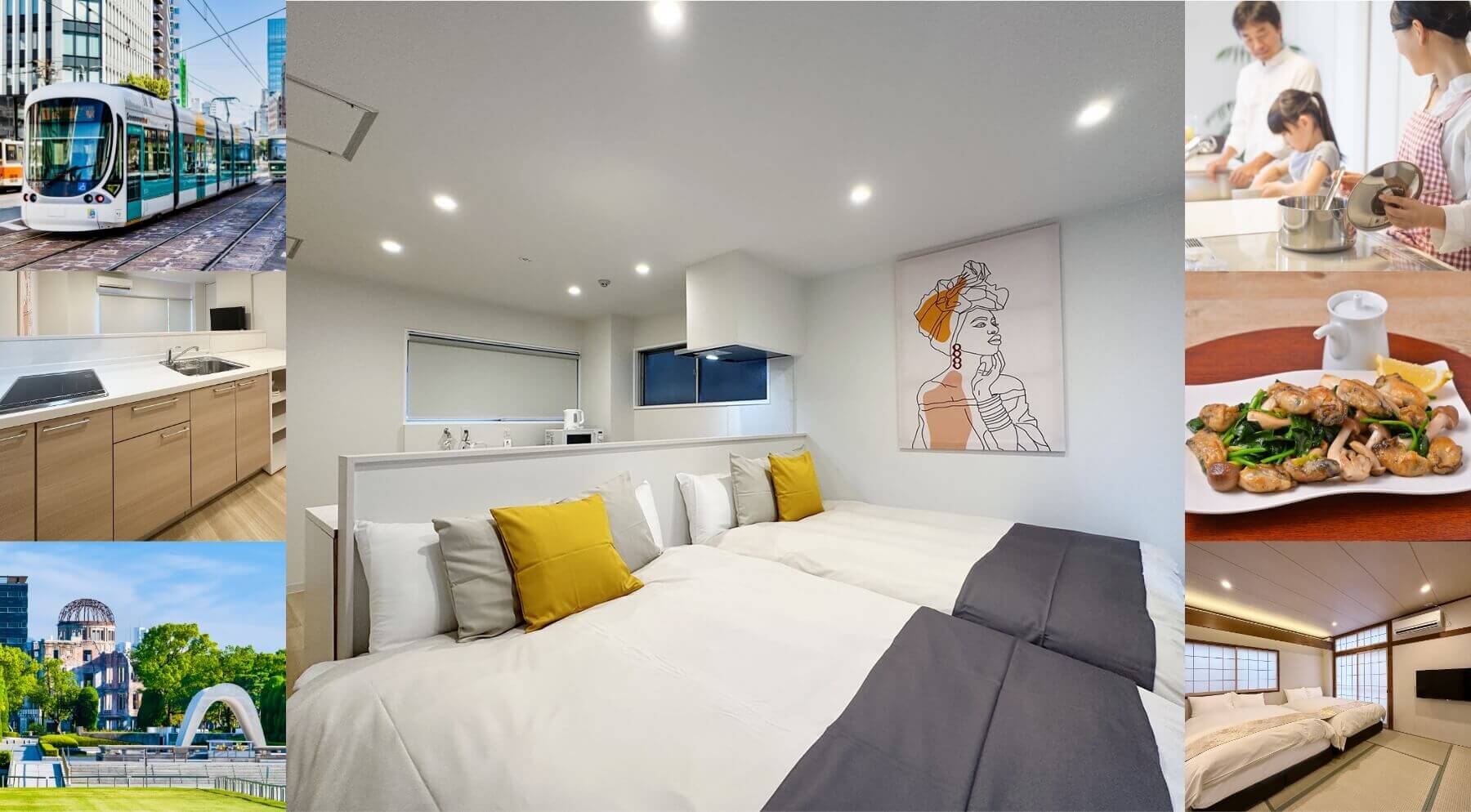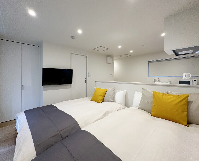 コンパクトなスペースにキッチンとダブルベッドを2つ配置した、シンプルで使い勝手の良いお部屋です。最大4名まで宿泊可能。広島の中心部に居ながら、窓からは公園の緑を眺められます。システムキッチンには、調理道具や食器、カトラリーをご用意。その他にも冷蔵庫や洗濯機、ドライヤーなど日常生活に必要なものを一通り揃えてあるので、長期滞在にも便利です。広めのクローゼットに荷物をしっかり収納できるので、お部屋をすっきりとご利用いただけます。