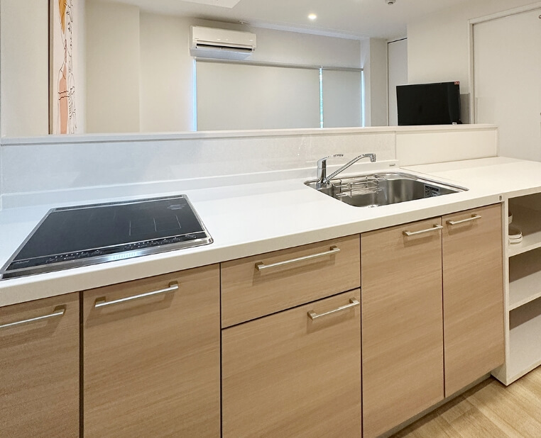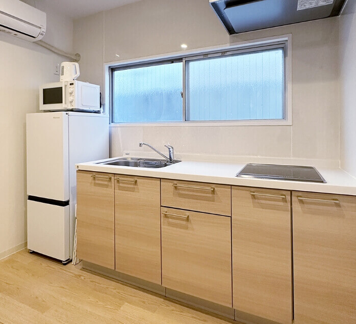 安全面にすぐれた IHクッキングヒーターを完備。調理台が広く、炊飯器や鍋などの調理器具も揃っているので、自炊を楽しめます。